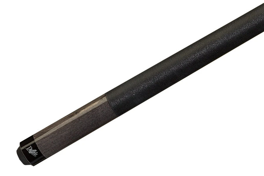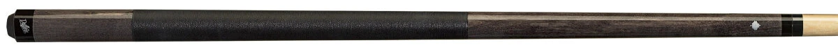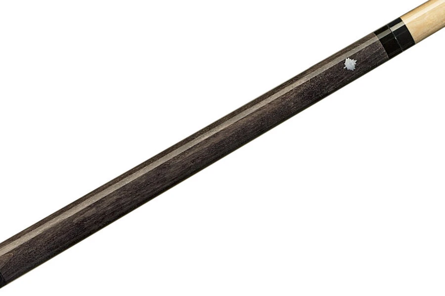 Einfaches, taubengraues Queue mit silbernem Ahornblatt-Logo und schwarzem Griffband aus irischem Leinen.