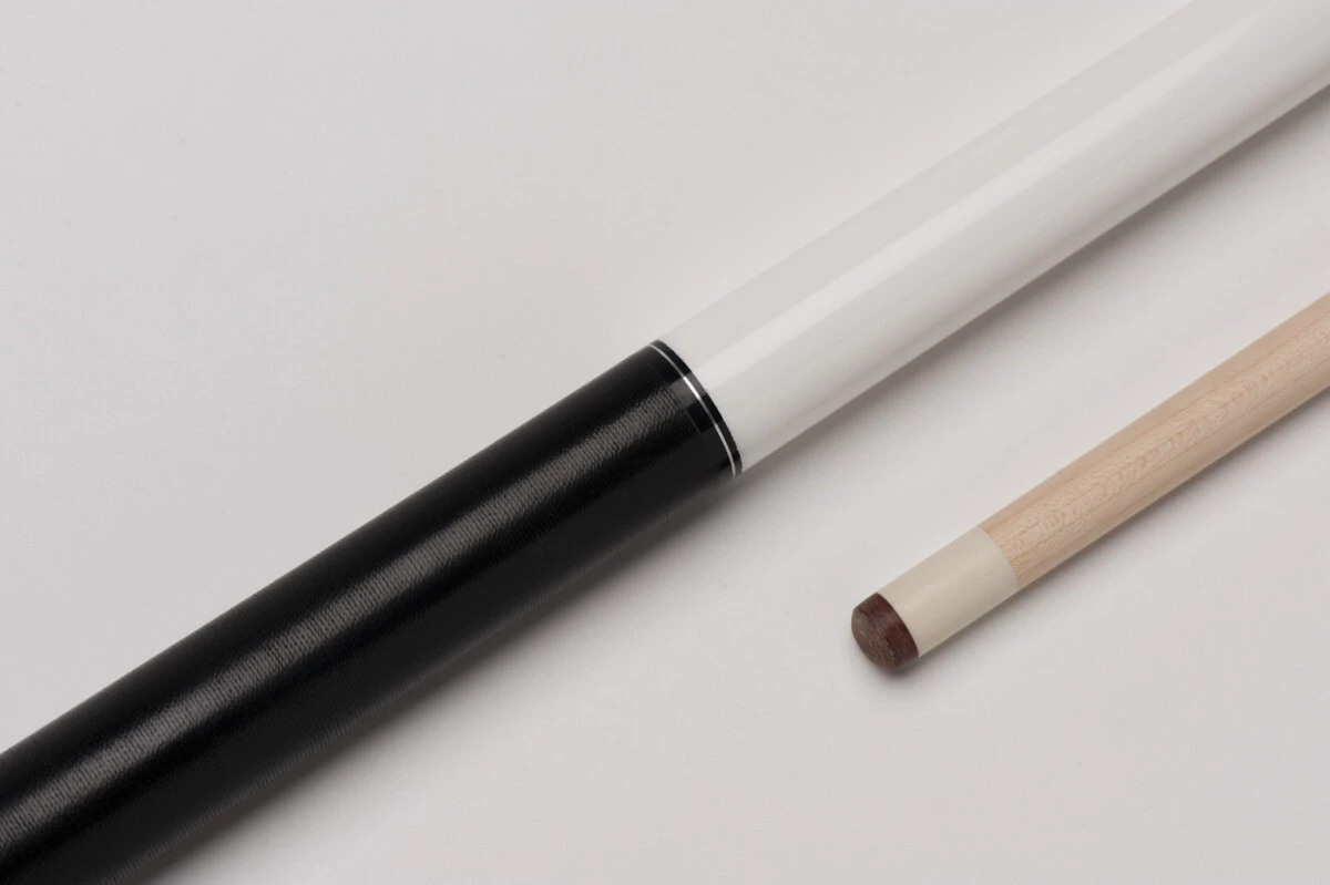 Wer sich ein einfaches, aber edles Queue wünscht, fährt mit den beiden Queues dieser Serie richtig. Das MF2-002 kommt in komplett weißer Lackierung daher und hat ein schwarzes Griffband aus irischem Leinen. Am Butt hat das Queue einen schönen eingelegten Zierring in Karo-Muster. Kleine Zierringe ebenfalls am Griffband und am Gewinde. Wir haben hier eine zuverlässige 3/8-11-Verschraubung aus Messing mit Holzgewinde für beste Kraftübertragung beim Stoß. Bei diesem Modell wurde eine Kunststoff-Ferrule verarbeitet und mit einem Qualitäts-Schichtleder versehen. Lieferung inkl. Gewindeschoner zum Schutz Ihres Queues.