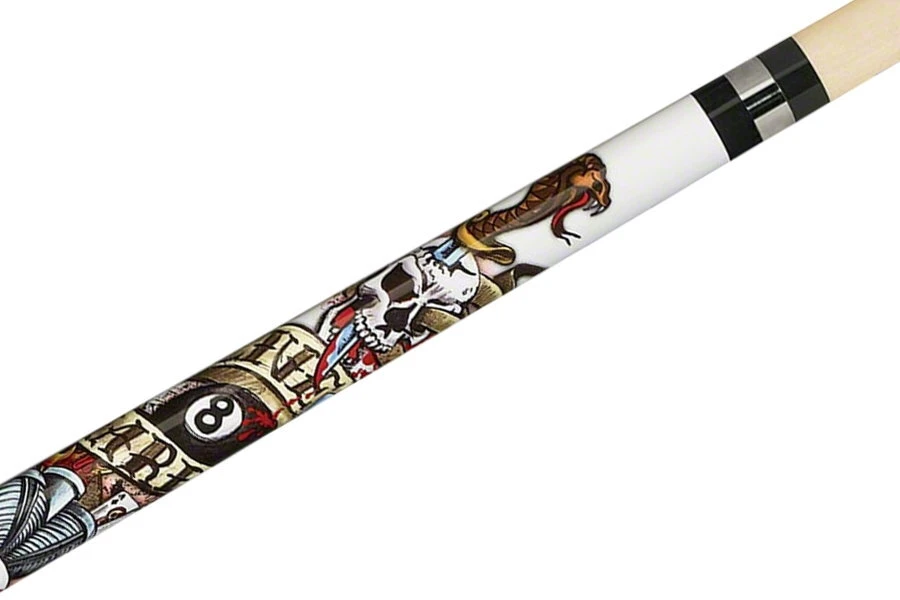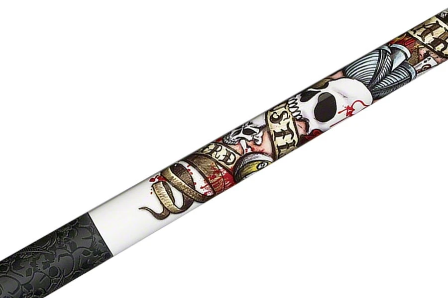 Für echte Hustler: „Live Hard – Hustle Hard“ ist das Motto dieses klassischen Queues aus Grade-A-Hartholz-Ahorn mit tattoo-inspirierten Verzierungen rund um eine schwarze Acht. Der gummierte Griffteil kommt dazu passend im schwarzen Totenkopf-Muster daher.