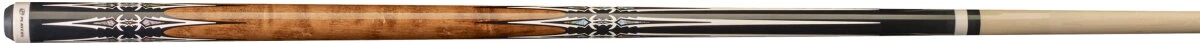 Antik gestaltetes Queue aus gebeiztem Vogelaugen-Ahorn mit perlmuttverziertem Dolchmotiv vorne und hinten und schwarz-weißem Gewindekragen. 5/16×18-Gewinde mit Implex-Joint, ohne Griffband.